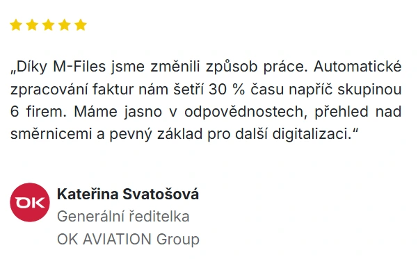„Díky M-Files jsme změnili způsob práce. Automatické zpracování faktur nám šetří 30 % času napříč skupinou 6 firem. Máme jasno v odpovědnostech, přehled nad směrnicemi a pevný základ pro další digitalizaci.“